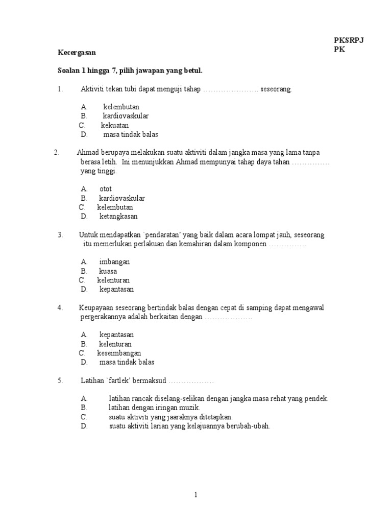 Kecergasan Soalan 1 Hingga 7 Pilih Jawapan Yang Betul Pksrpj Pk