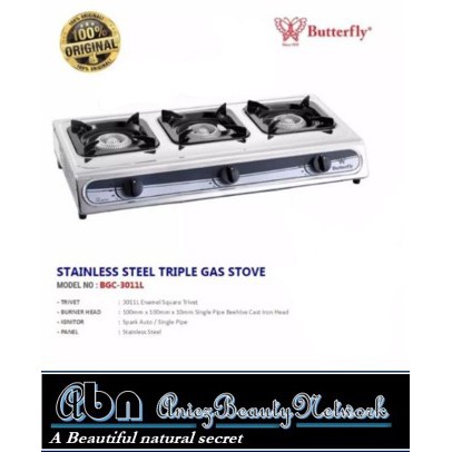 Butterfly Stainless Steel Triple Gas Cooker Stove Dapur Gas 3