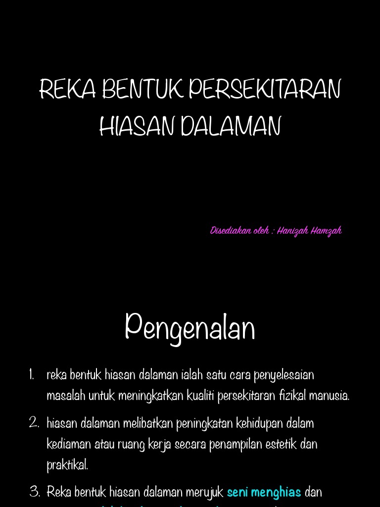 Siti rosni binti nik mohd zaid peranan pereka bentuk hiasan dalaman peranan pereka bentuk hiasan dalaman pereka bentuk hiasan dalaman berperanan merancang untuk menghias ruang dalaman dengan menitikberatkan aspek aspek dan fungsi. Berlaku apabila manusia pandai menghias tempat tinggal mereka di dalam gua dengan lukisan lukisan dinding. Oleh itu adalah wajar bahawa gaya dan tema yang sama digunakan secara menyeluruh. Jenis perabot dan.