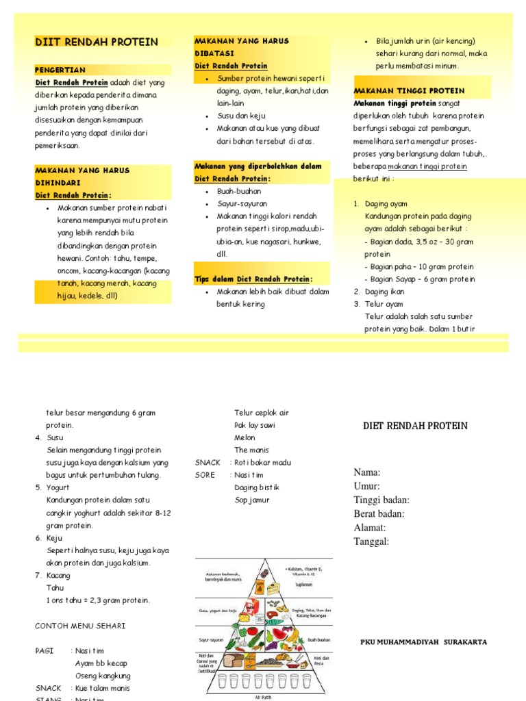 Diet dengan makanan rendah protein ini diberikan biasanya diberikan pada seseorang yang mengalami masalah gagal ginjal. Dalam 1 ons una mengandung 30 gram protein dan 157 kalori. Bagian putih telur ayam sebanyak 2 butir memiliki kandungan lemak yang sangat rendah namun kaya akan protein. Demikianlah beberapa contoh sumber protein masih banyak lagi sumber sumber lain yang dapat menghasilkan zat yang cukup penting bagi tubuh kita tersebut.