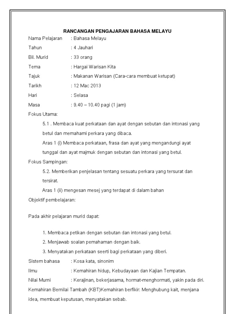 Doc Bahasa Malaysia Tahun 5 Rancangan Pengajaran Harian Mem Mm