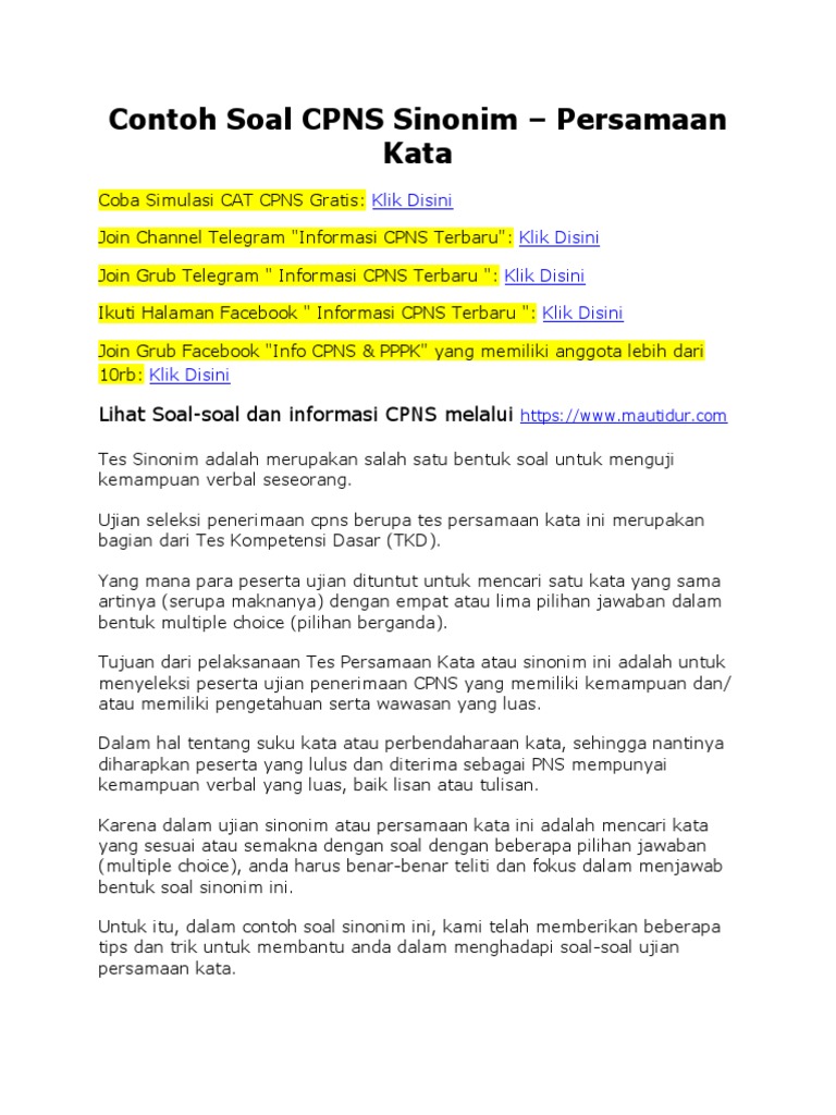 100 Contoh Soal Cpns Sinonim Persamaan Kata Mautidur Com