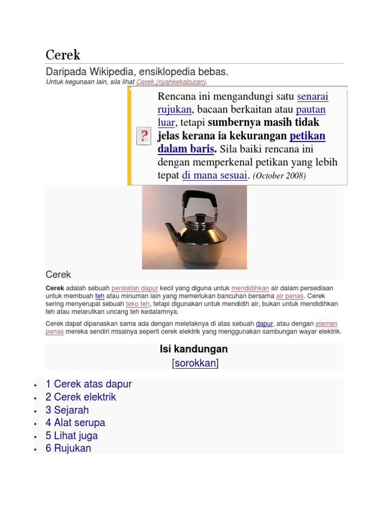 Kemudian buka kedua dua skru yang terdapat di bahagian tepi. Cerek pertama digunakan pada jaman. Selepas siap dipanaskan simpan air tersebut ke dalam bekas termos. Cerek dapat juga berupa sebuah peralatan dapur kecil yang bentuknya mirip dan berfungsi secara mandiri.